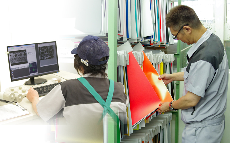 | 技術課 | 私は調色という作業を担当しています。顧客が営業へ依頼した色・外観を再現する仕事です。同じ色でも、柄やエフェクトが違えば、色が違って見えることもあるので大変ですが、やりがいのある仕事です。![]() |